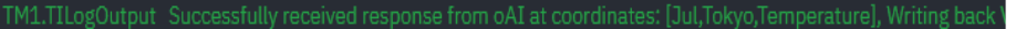 You will notice that we must do string parsing on JSON without any external libraries to build the request and extract the response. This can be quite tedious, but the output format for this API does not change when querying this endpoint. In this way, we can safely plan to locate the key ‘content’ and write the value of that pair back to our cube. Now, let’s test this process on a single data point. From my existing dataset I deleted our temperature entry for Tokyo in July.